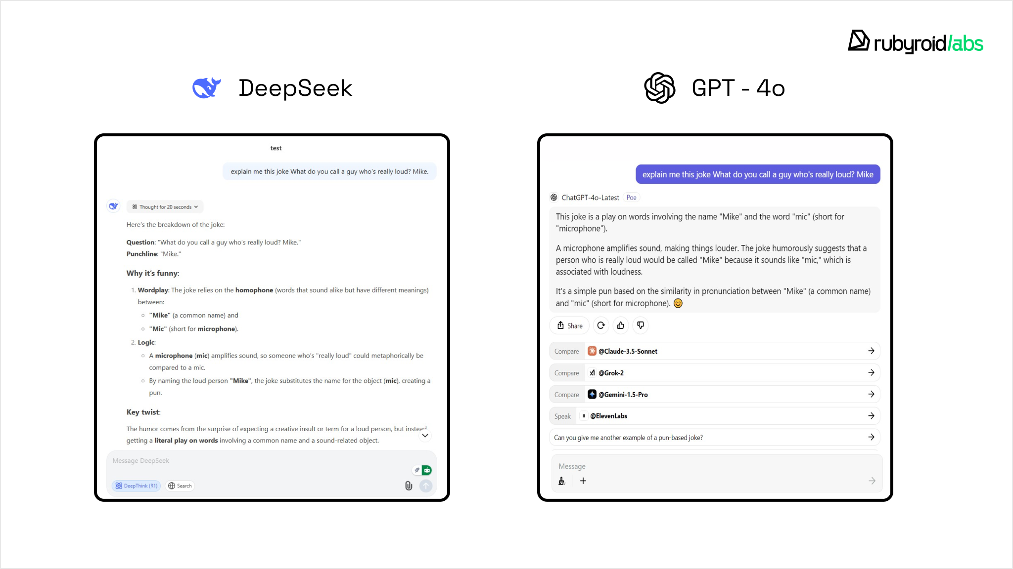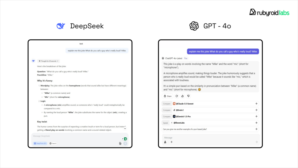 While ChatGPT is quite familiar to everyone, DeepSeek has recently become the subject of interest. In our company, we use ChatGPT-4o for our internal purposes, so we decided to test DeepSeek R1 as well. Our feature comparison will be backed by our practical experience.