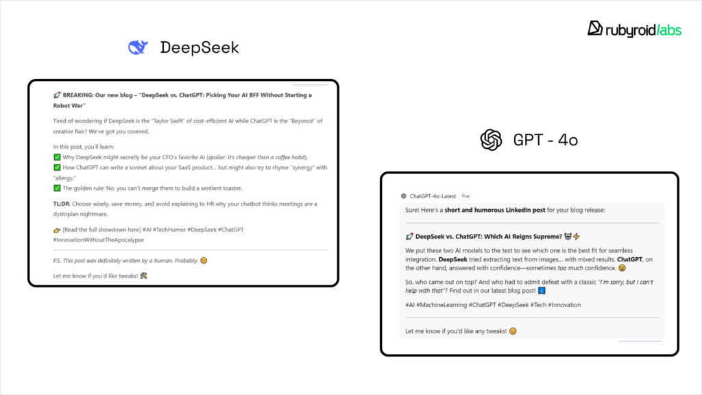 On the other hand, DeepSeek created LinkedIn posts with sharper humor than ChatGPT.