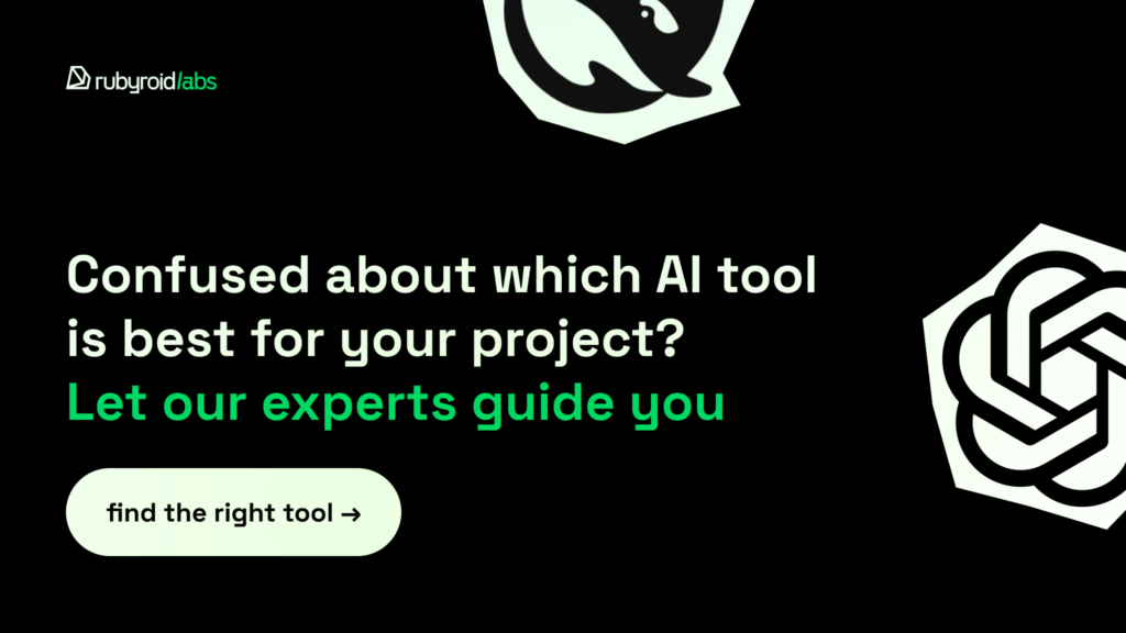 At Rubyroid Labs, our AI developers have extensive experience in building AI-driven solutions for projects. Our portfolio includes chatbots for selecting sports equipment, AI assistants for fitness apps, smart data analysts for insurance enterprises, conversational AI for e-learning platforms, and more. Get in touch with us if you need expert insight on your project idea. We can help.