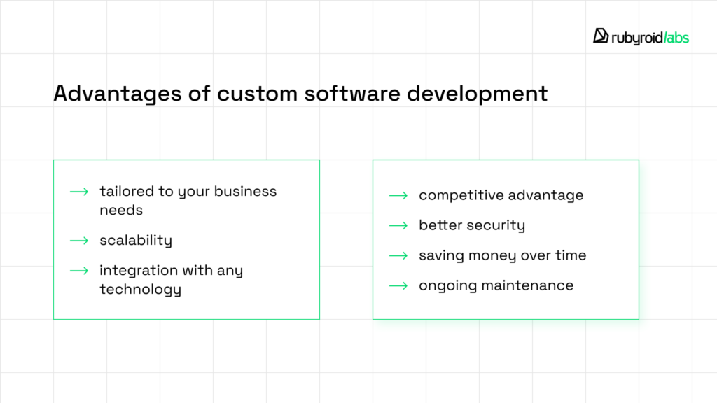 By building custom software, you can avoid these issues. However, like any solution, bespoke software development comes with its own set of pros and cons. Let’s explore them in detail.