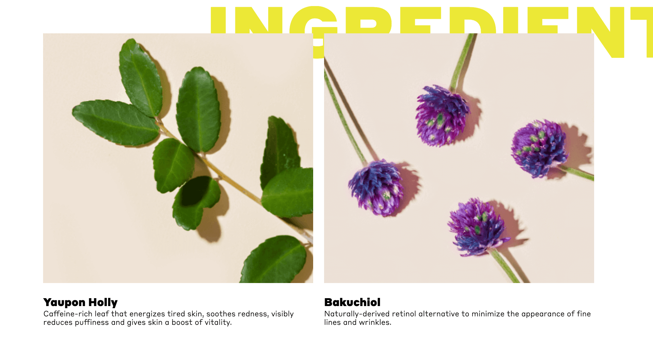 On Volition, beauty products are often accompanied with highlights that point out their key ingredients and what they do.