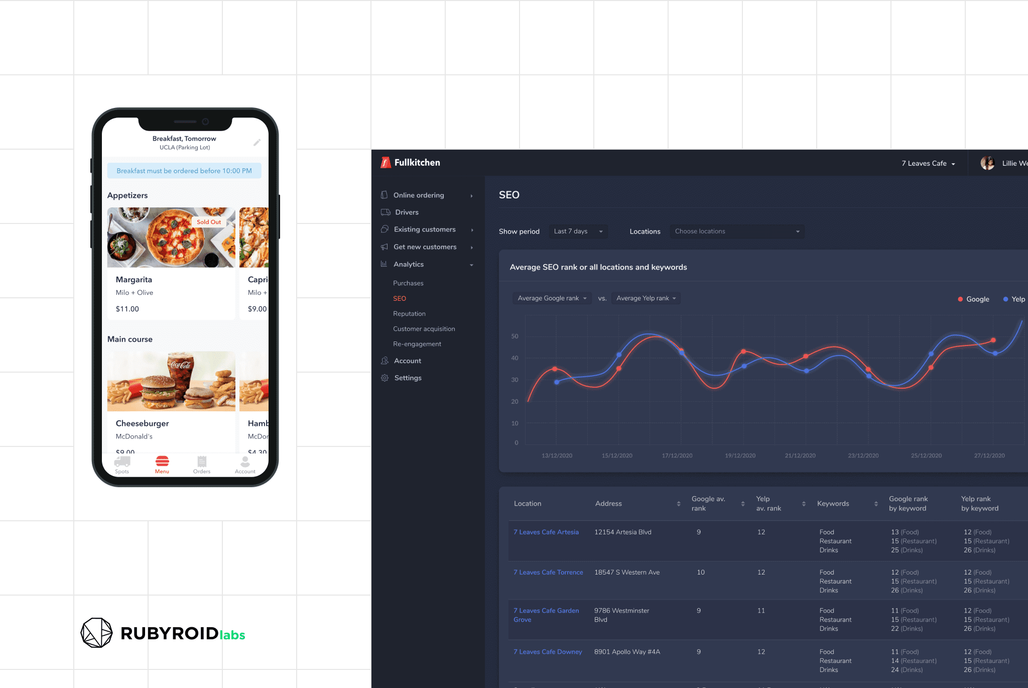 Rubyroid Labs has helped startups backed by YCombinator, Seedcamp and Capital Innovators build their products and raise total funds exceeding $500 million. Therefore, it’s no surprise that a new company, FullKitchen, used our food delivery app development services. Those included interface design, infrastructure set up, coding, launch and maintenance.