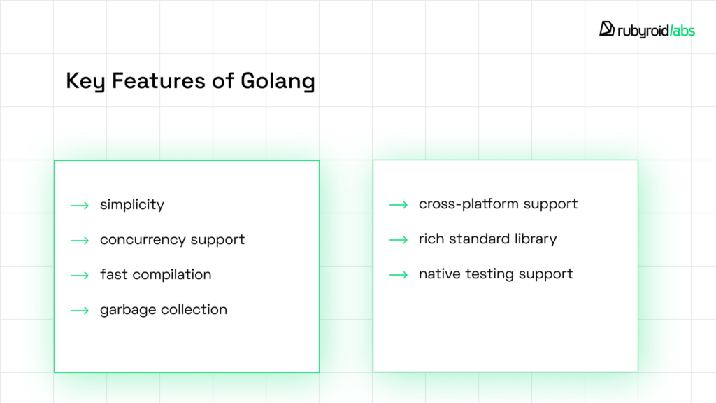 - Strong native instruments. Go’s built-in tools, such as efficient memory management, garbage collection, and concurrency, make it possible to build stable and performing applications, which guarantees their smooth and uninterrupted work.