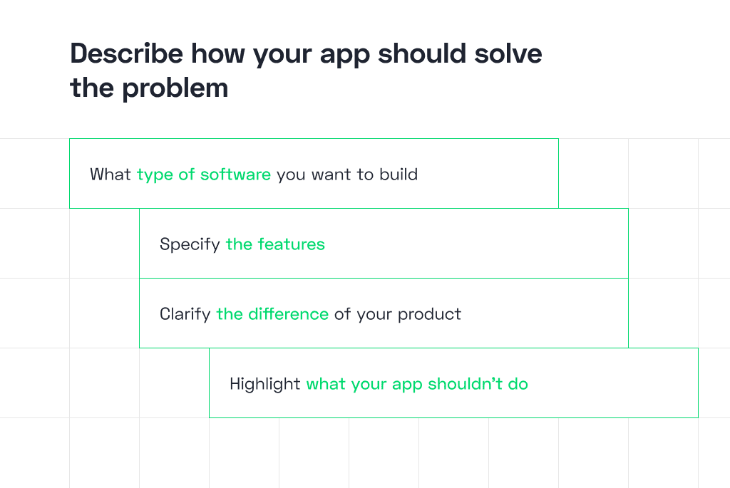 Try to describe each feature in detail that you want to be included in the application or system and what problem it will solve. Take some screenshots of similar apps as a reference for better understanding what you want.