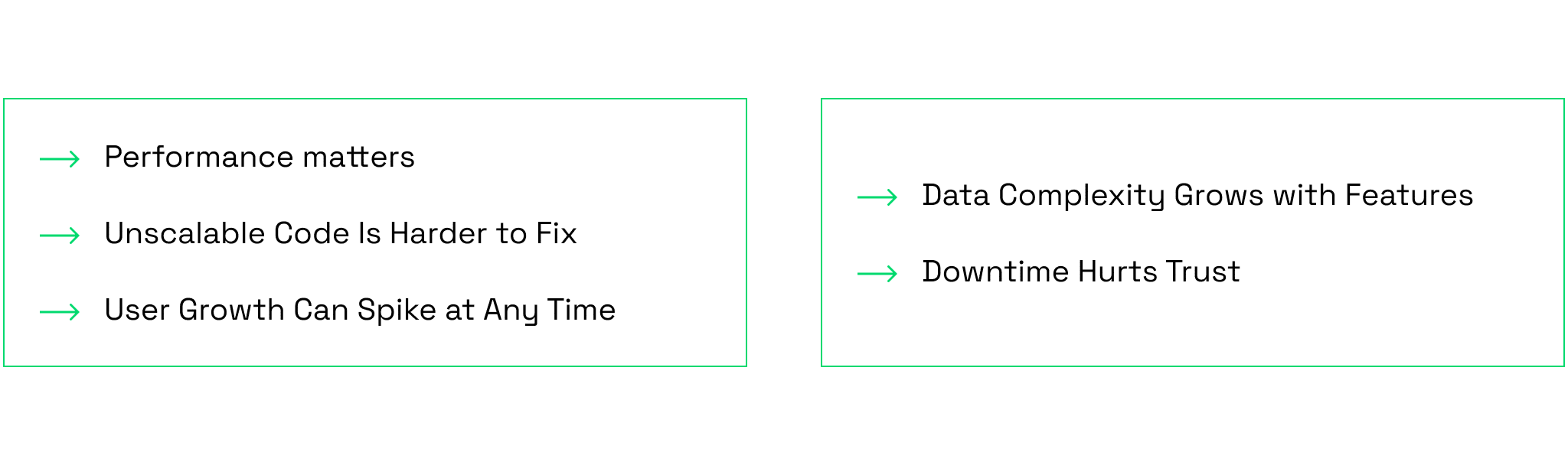 If scalability isn’t considered in your early decisions (e.g., database structure, background jobs, caching), you might have to rework large parts of your app later. That means more time, higher costs, and slower development when it really matters.