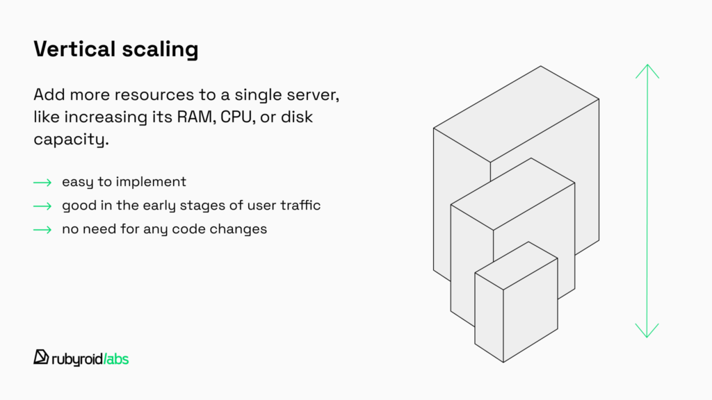 Most product owners naturally start with vertical scaling because it’s the simplest and fastest way to give an overloaded server some breathing room as usage grows.