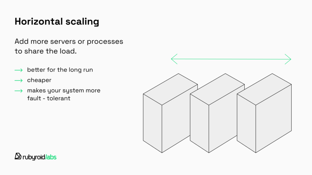 In this case, as a Rails development company, we advise doing vertical scaling together with horizontal scaling. This way, you’re making your servers more powerful and your entire system more resilient and future-proof.
