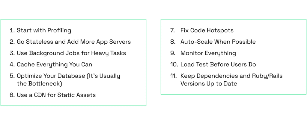 New versions of Ruby and Rails often come with performance improvements. Don’t wait years to upgrade. Staying current makes scaling easier.