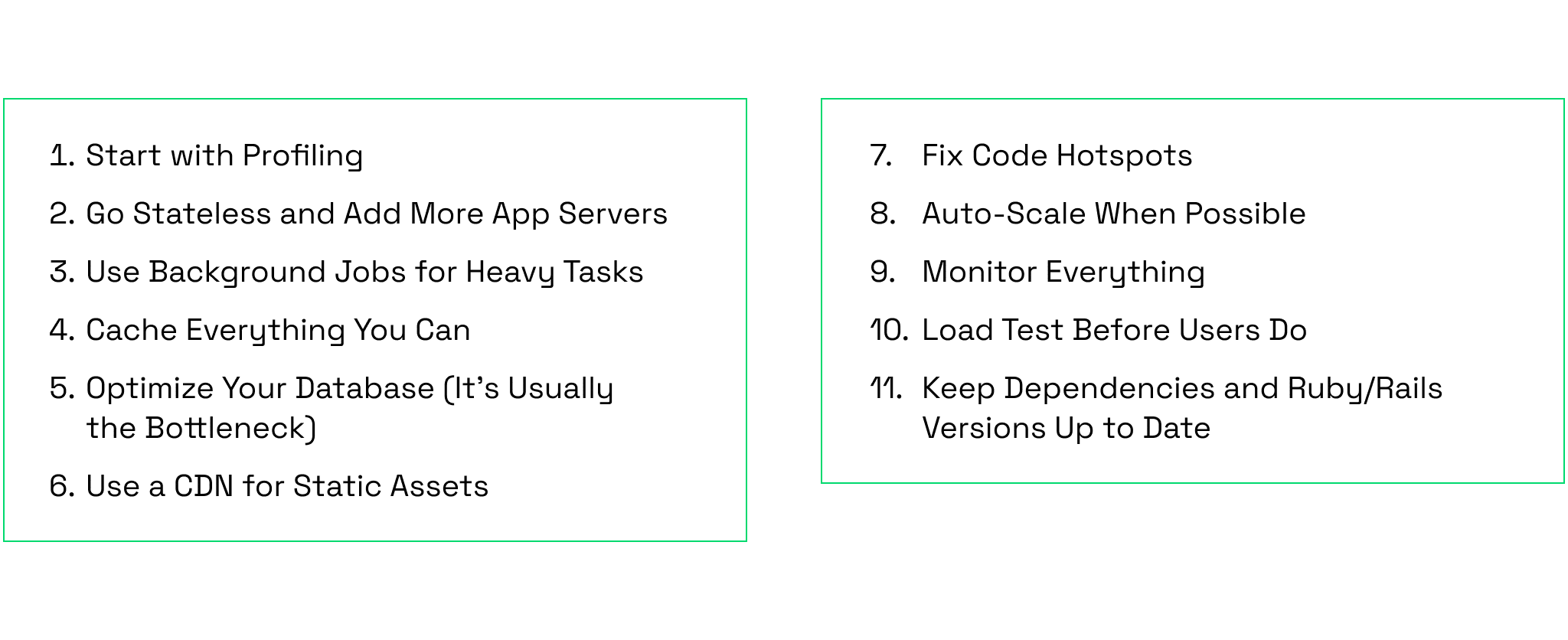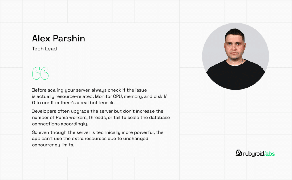 Before scaling, measure first. Use tools like Skylight, rack-mini-profiler, or New Relic to identify bottlenecks.