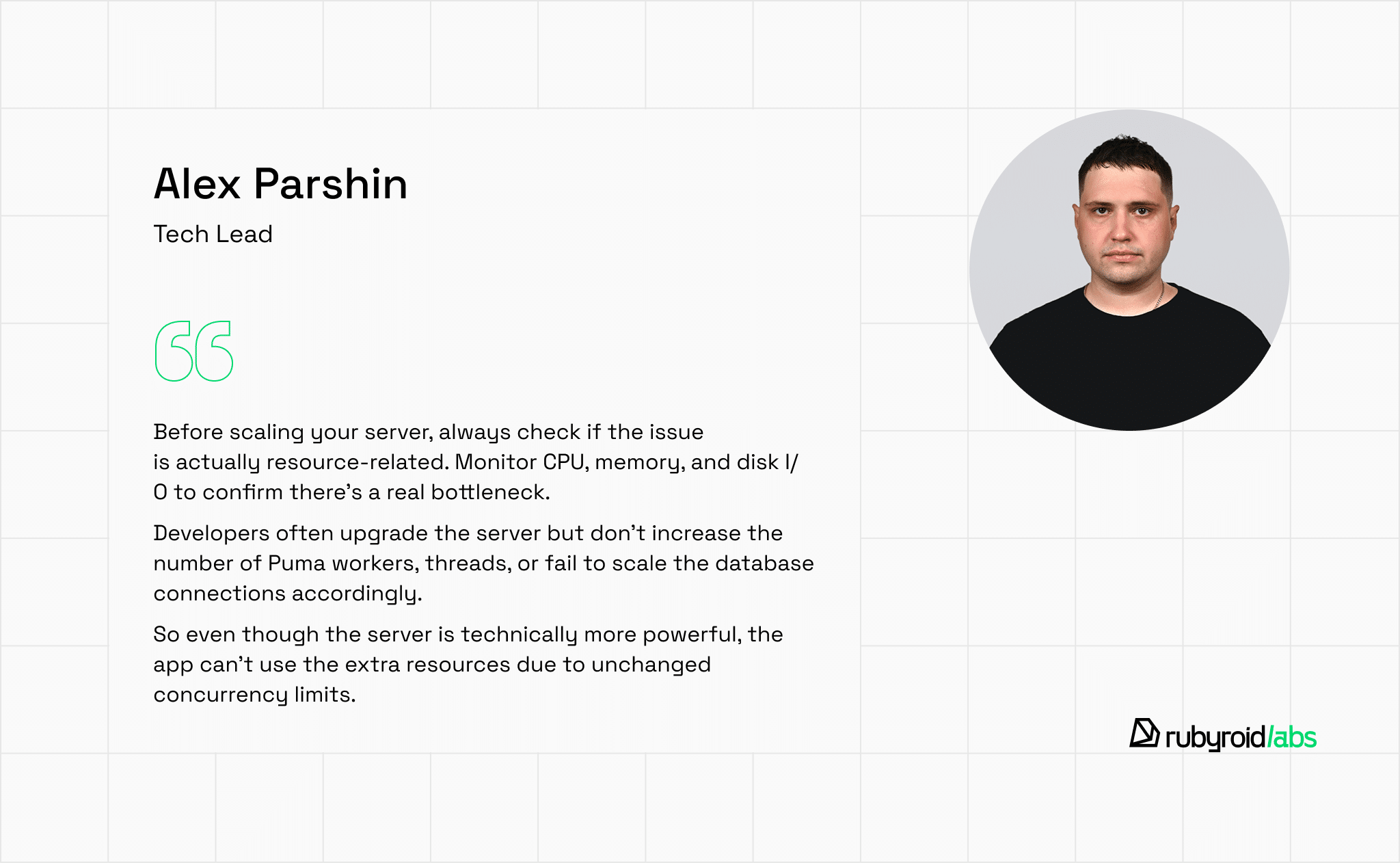 Thus, when we helped Yelz online store with growing, we started with vertical scaling by slightly increasing RAM and adding a few database threads and workers. To further boost concurrency, we introduced horizontal scaling by running multiple Puma instances behind a load balancer, ensuring better request distribution and reliability under traffic spikes.