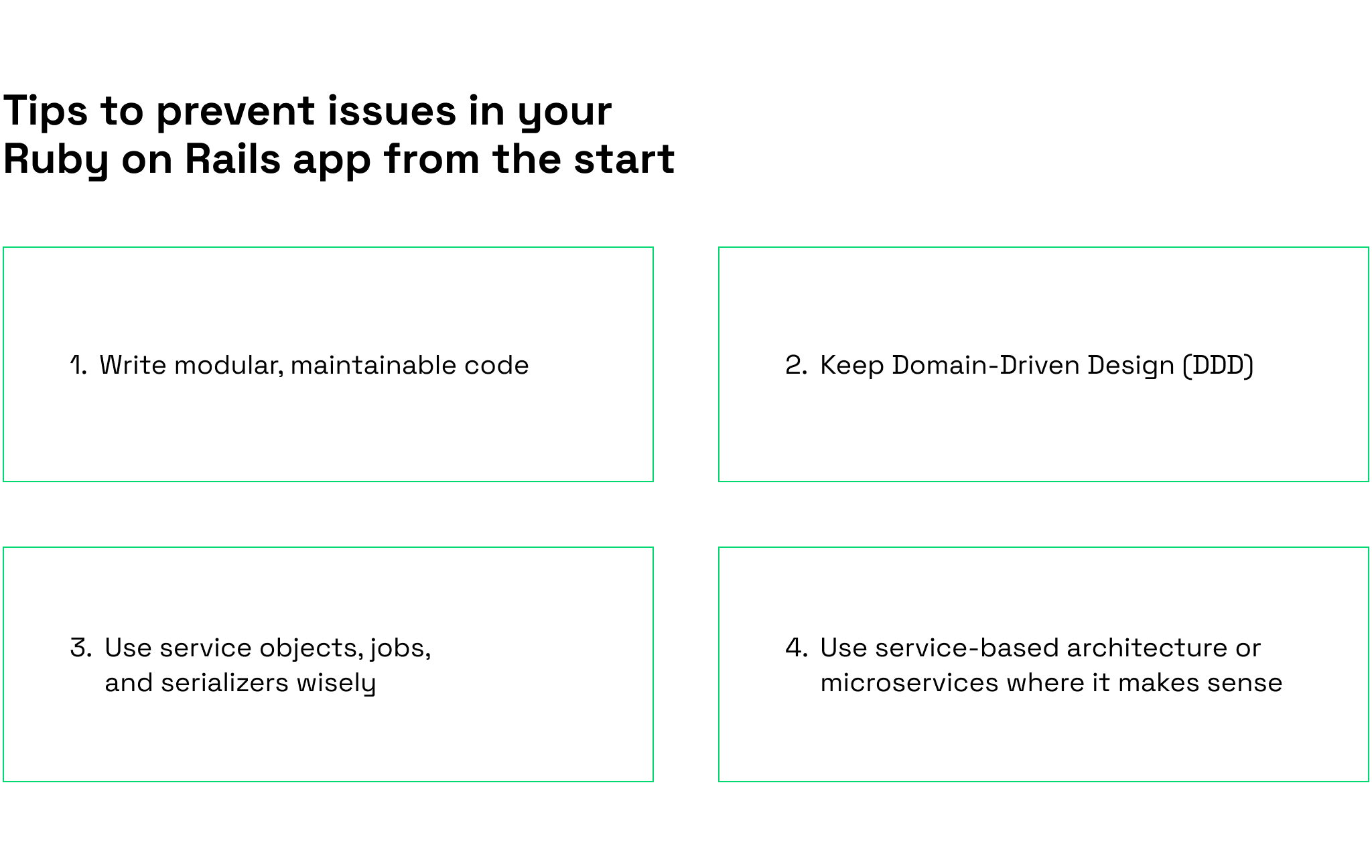 To keep things running smoothly and scale your application effectively, it’s best to hire a skilled Ruby on Rails development team that understands how the Rails codebase behaves, knows what pitfalls to expect, and can address them in a timely manner.