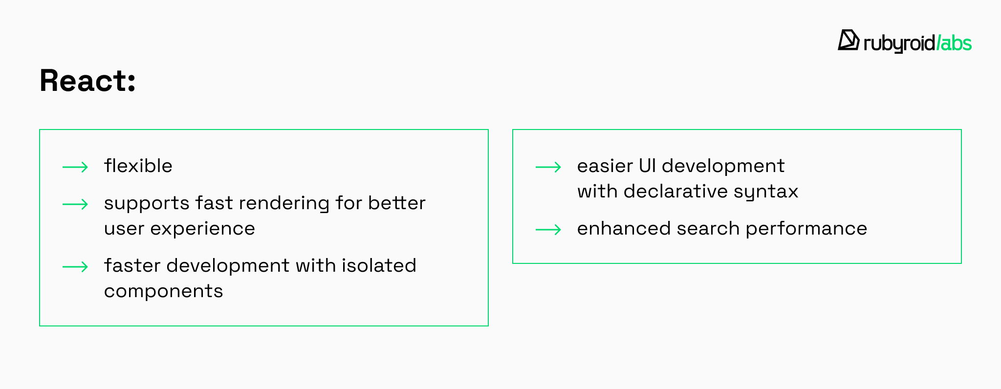 At Rubyroid Labs, we rely on this flexibility offered by the library when we develop ReactJS platforms and applications.