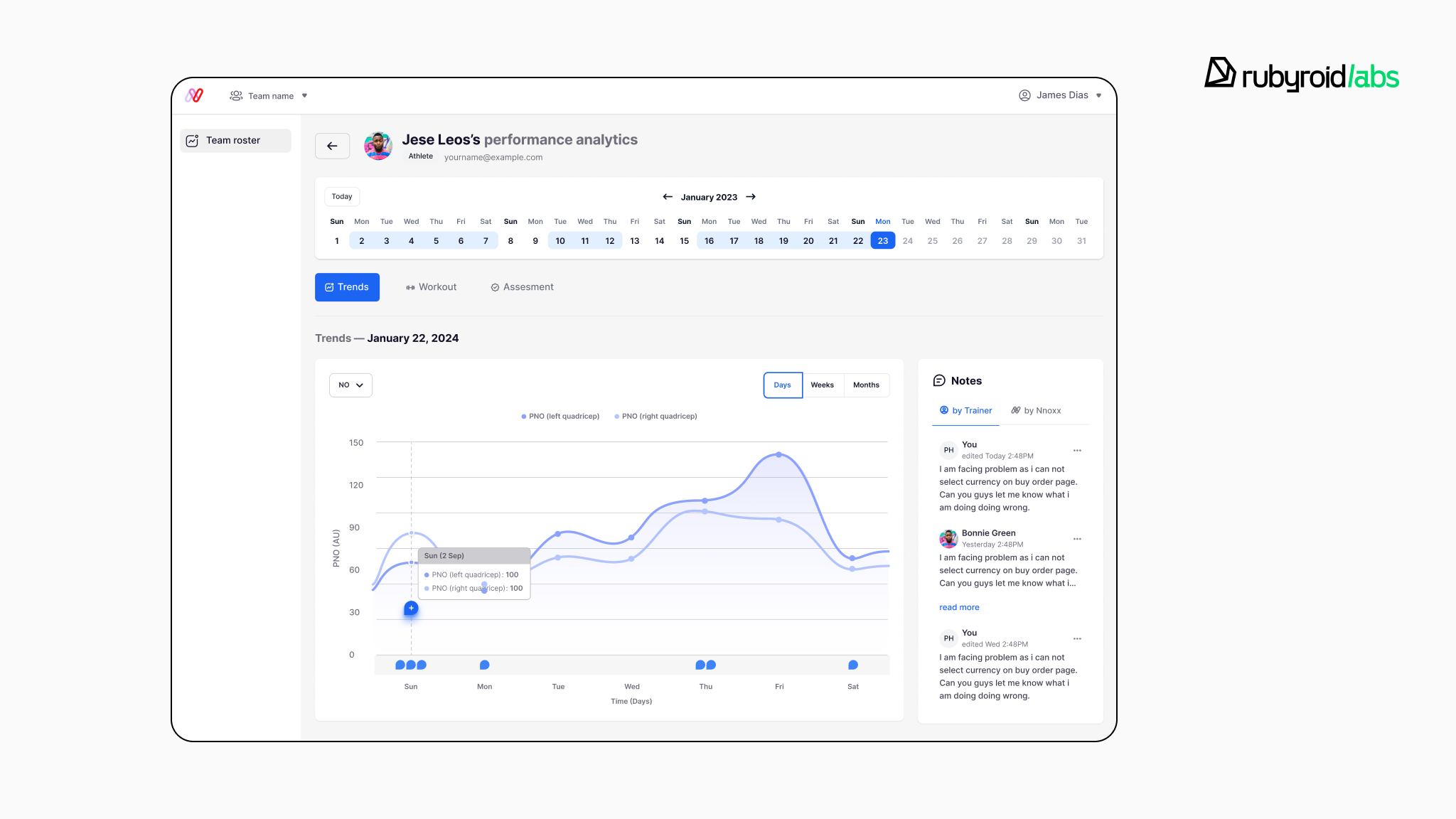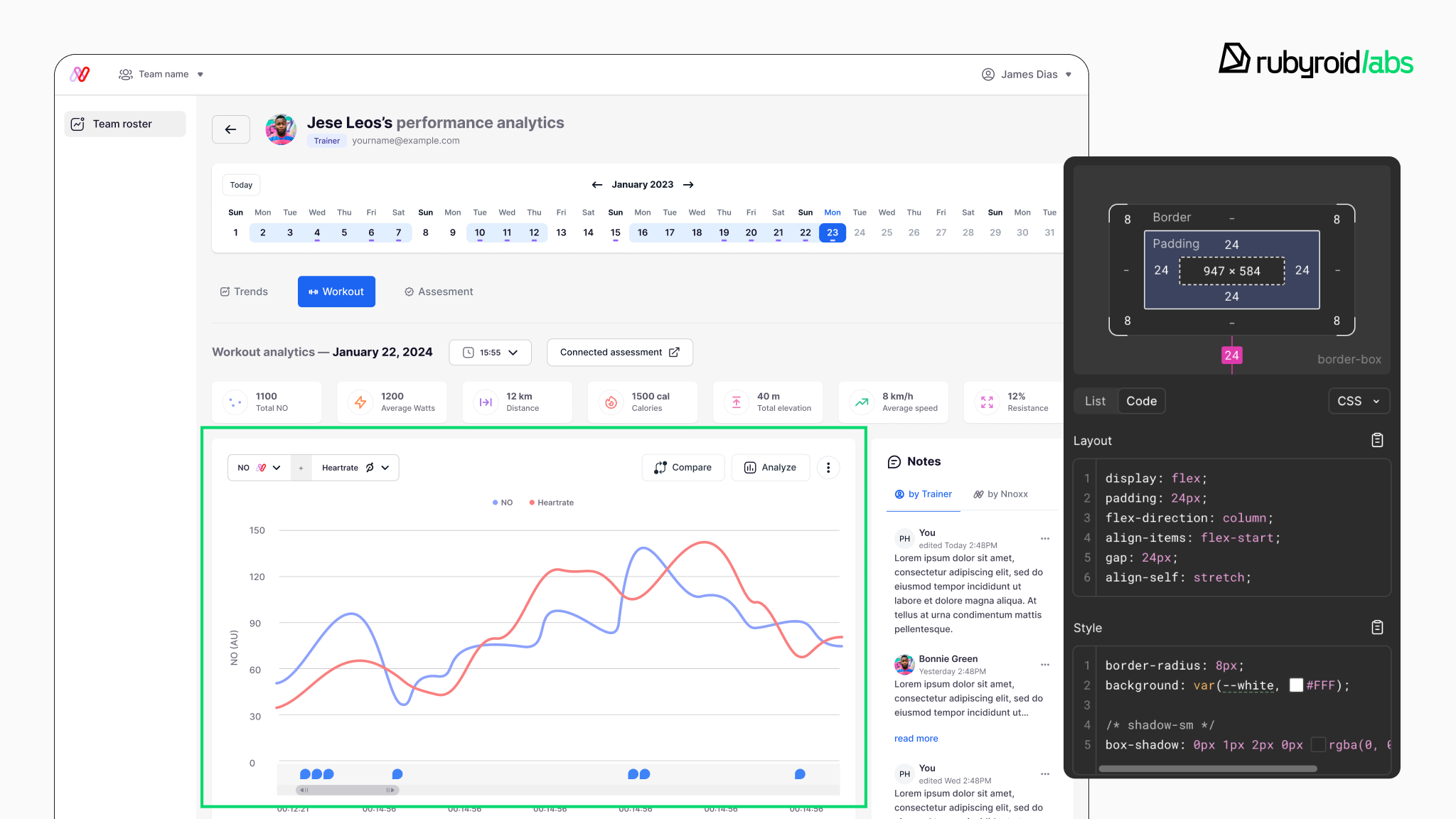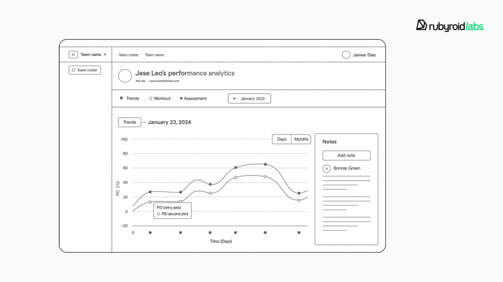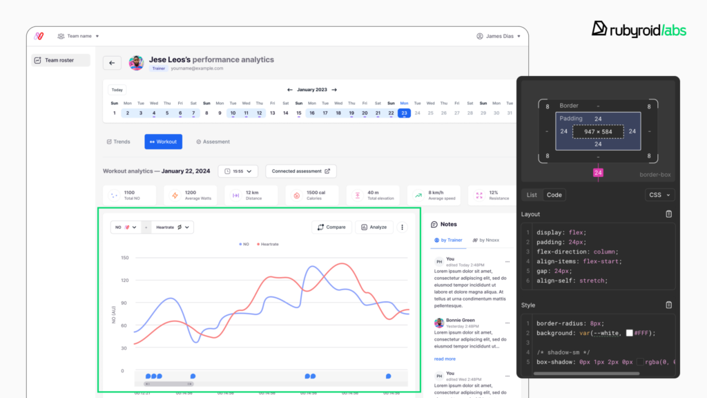 Our developers kept adding new functionality, expanding user roles, and improving data flows. One of the major updates during this phase was the rollout of tools for system users. They got access to CSV workout data downloads, full team management controls, performance analytics, advanced workout comparisons, and note management features. Throughout this phase, we ran regular testing cycles.
