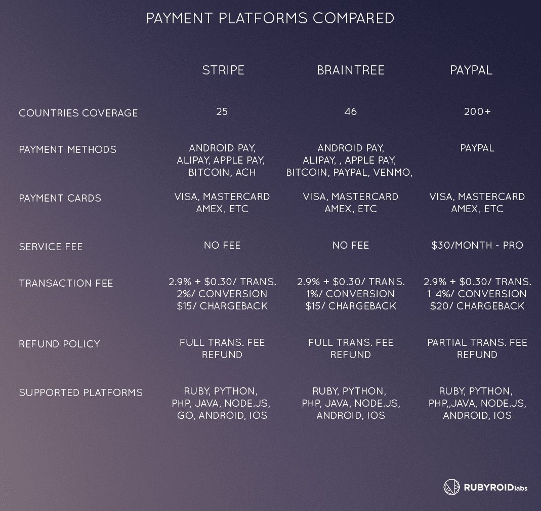 As you see, there are quite a few factors to look into. Basically, Paypal suits best for eCommerce solutions with a large geographical coverage. Braintree will offer most advantageous options for your customers and Stripe is the only one, that accepts ACH.