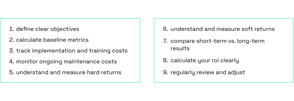 Measuring the return on your AI return on investment doesn’t have to be guesswork. By breaking down the process into manageable steps, clearly defining your metrics, and understanding the differences between hard and soft returns, you’ll be better equipped to gauge the true impact of AI on your business.