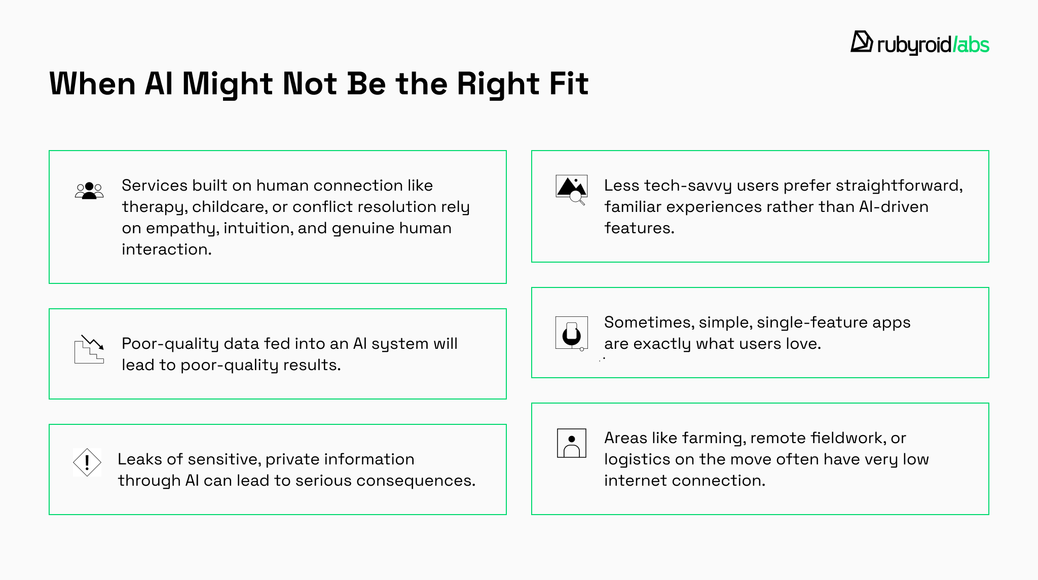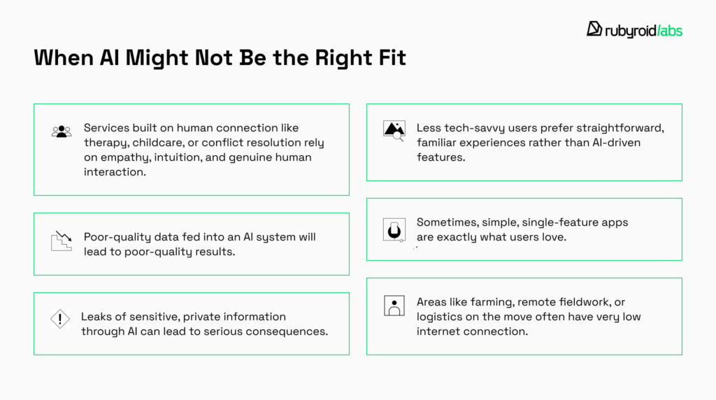 If you’re feeling inspired by the earlier examples of AI integration, that’s great. But don’t assume AI is the perfect solution for every industry or problem. While it’s one of today’s most talked-about technologies, there are situations where the ROI can be, let’s say, easily overestimated.