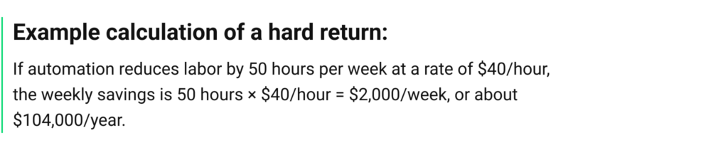 - Cost savings from automating manual tasks, resulting in fewer labor hours or reduced error rates.