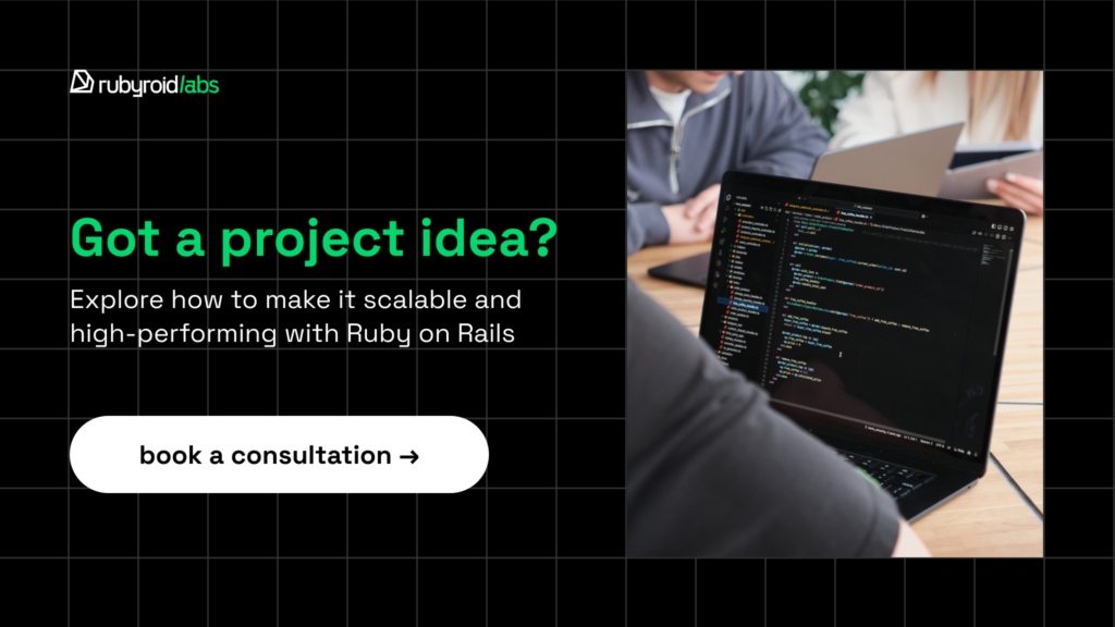 If you have a startup idea or an exciting RoR project, let’s talk! Our developers are ready to discuss your vision, estimate the project, and create a step-by-step roadmap to bring your vision to life.