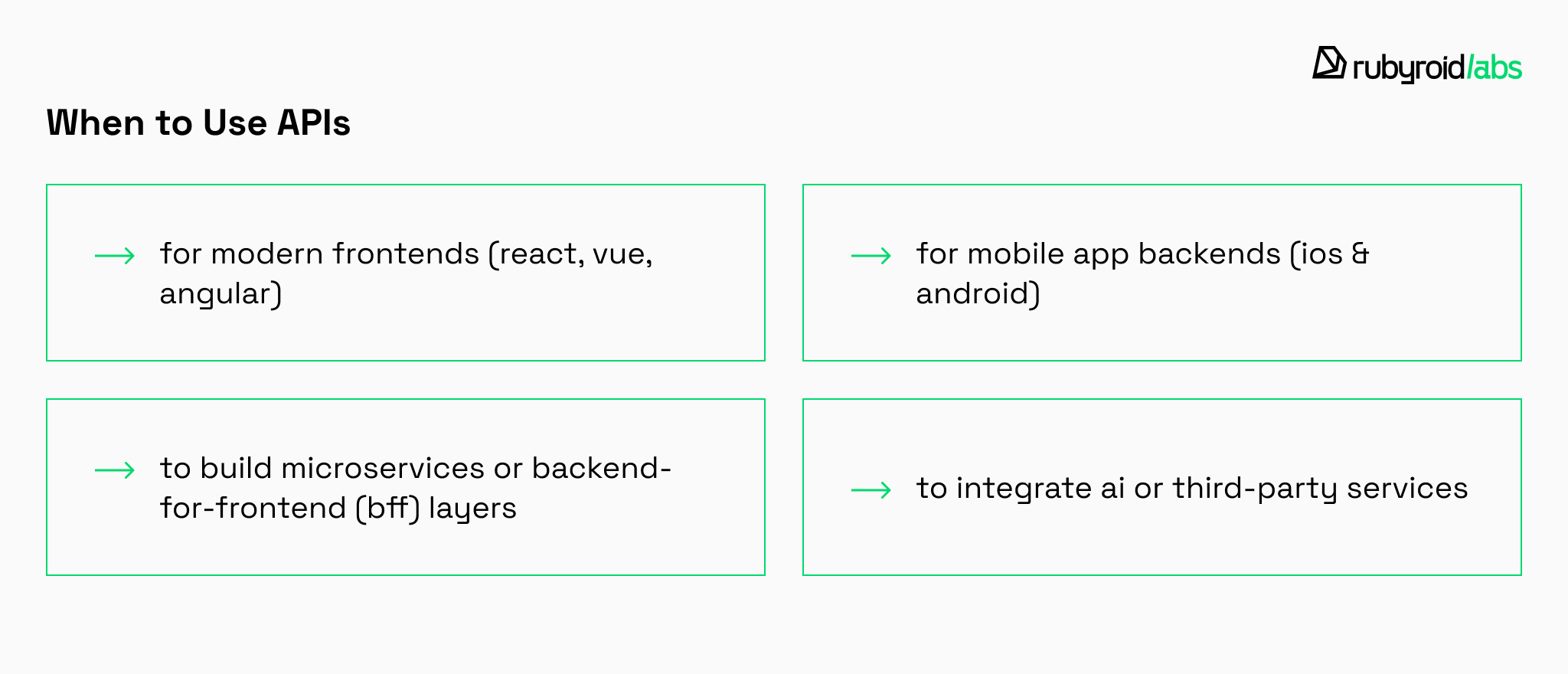 So, when we don’t need a full Rails app with views and layouts, we use Rails API mode instead. It’s perfect for connecting features, integrating third-party services like payment systems or AI, or supporting a mobile version that shares the same backend.