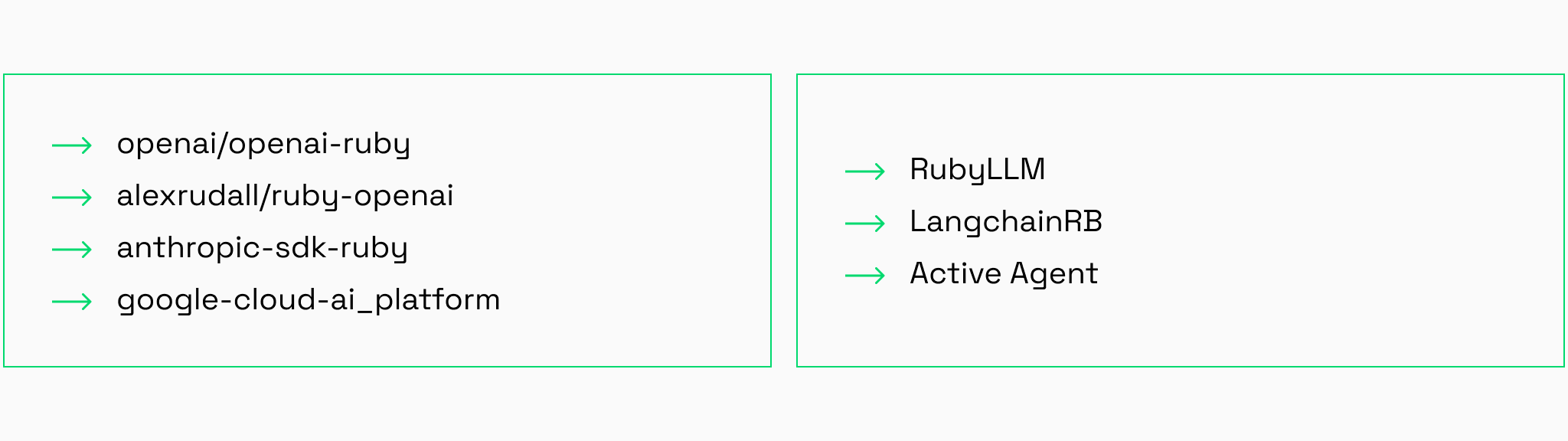 SDKs aren’t tied to Ruby. AI providers ship SDKs for multiple languages so teams can integrate their models wherever they need them. What we see inside a Rails codebase is the Ruby slice of that SDK, wrapped as one or several gems.