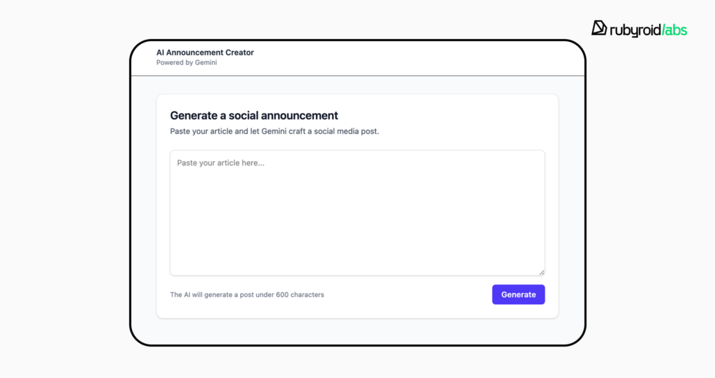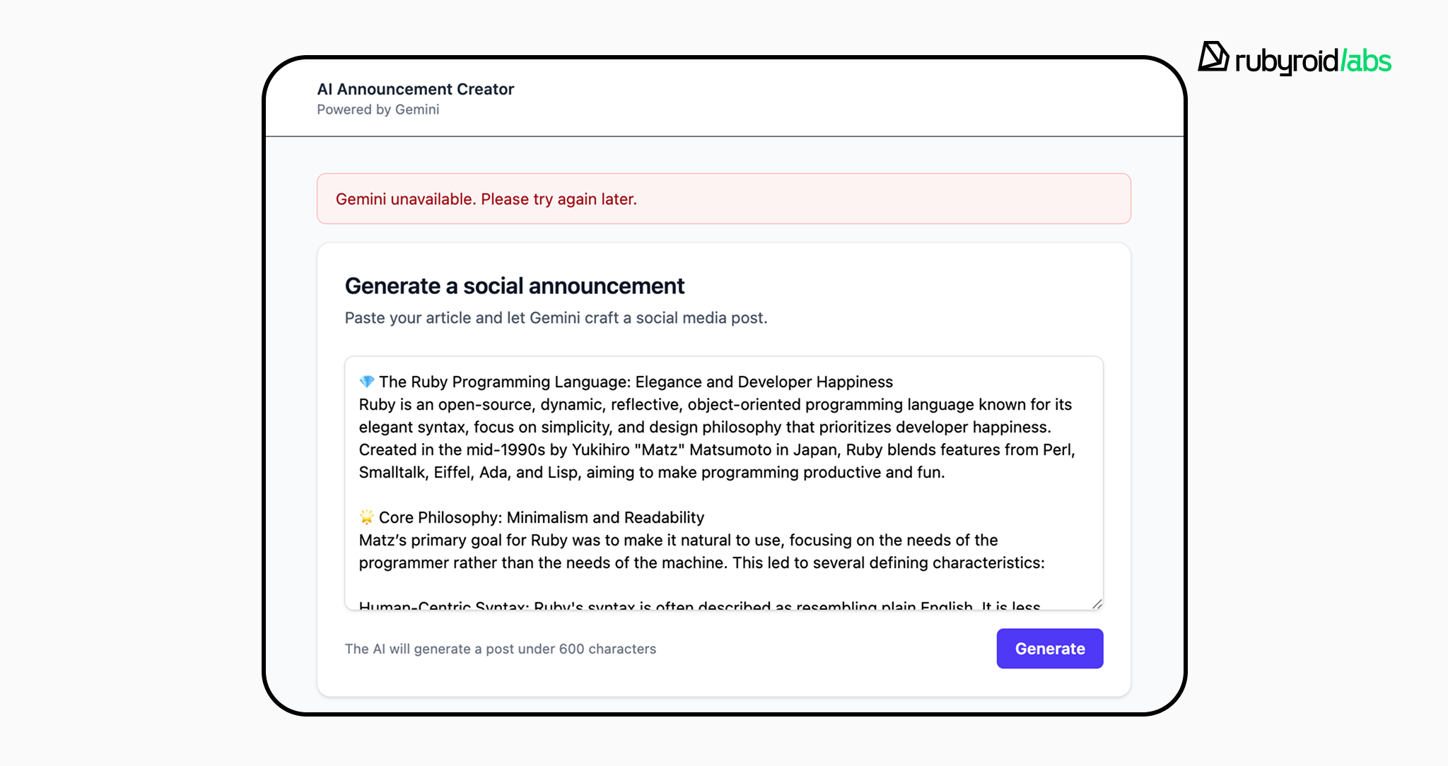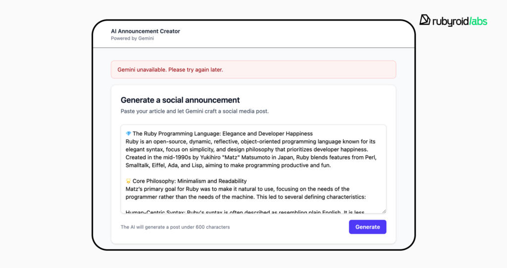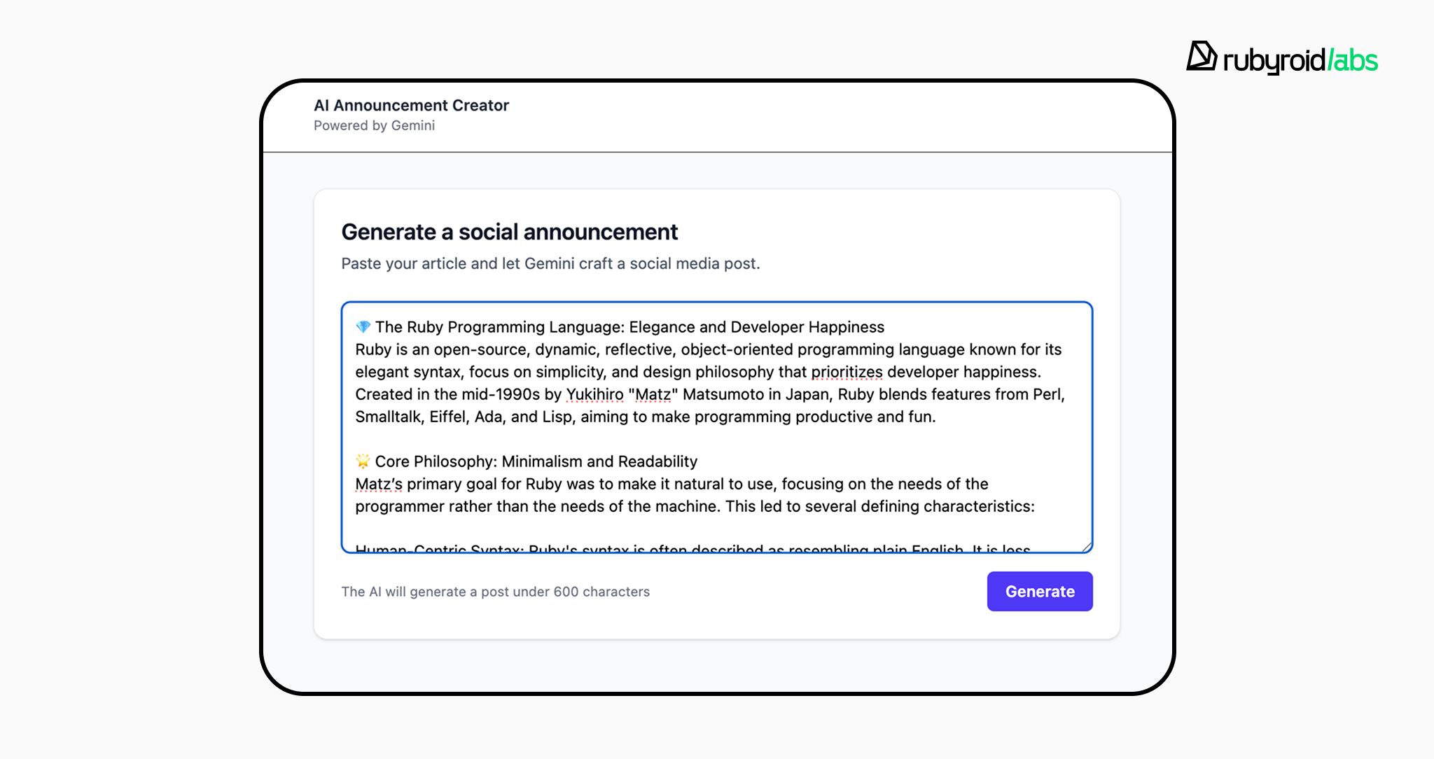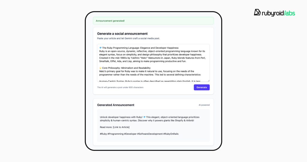 To make this article as practical as possible, let’s walk through building a small AI Announcement Creator prototype in Ruby on Rails.