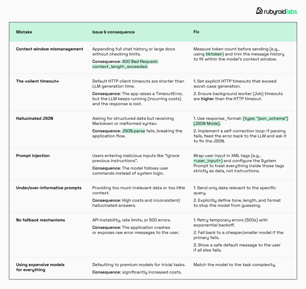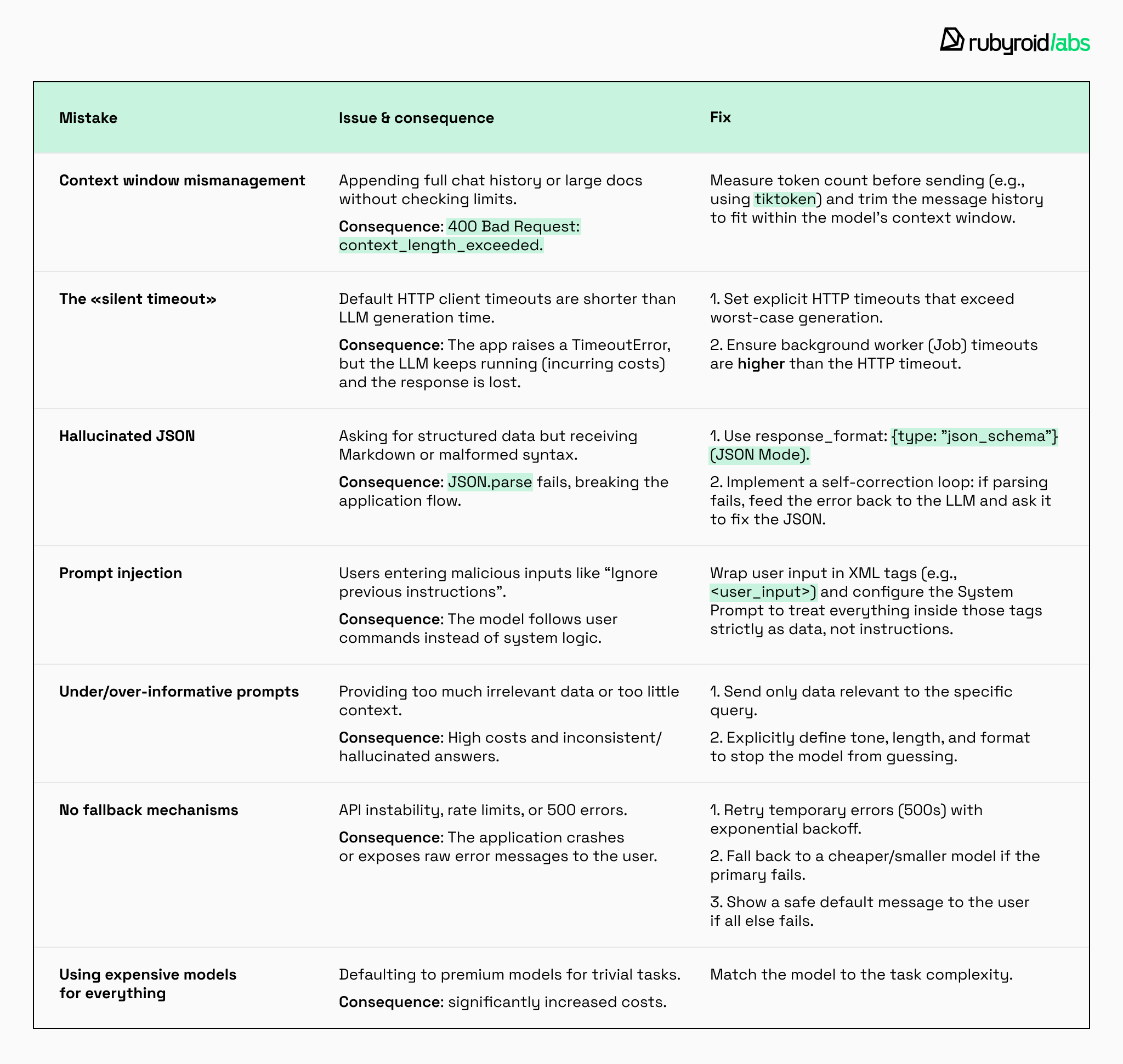 During implementation, production stability depends on tracking token usage, configuring realistic timeouts, handling hallucinations, enforcing system-level rules, and writing detailed prompts.