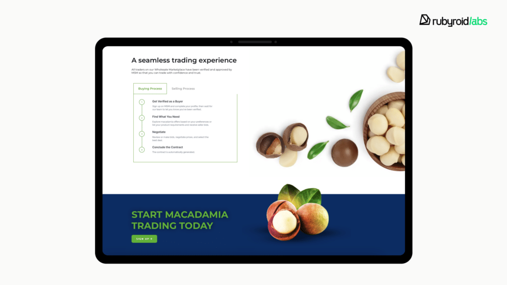 Macadamia sales market. A global trading platform for macadamia nuts. We improved scalability, added support for multiple nut types, and introduced bidding features and company roles.