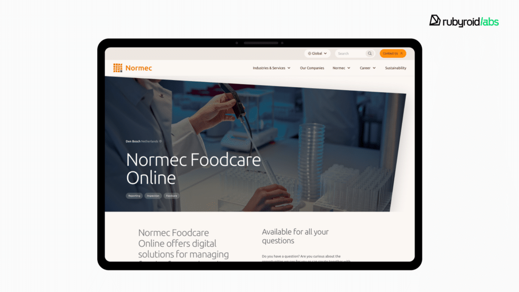 Normec Foodcare. A food safety and quality assurance platform in the Netherlands. We refactored legacy code, built a new Specification Manager tool, and modernized infrastructure.