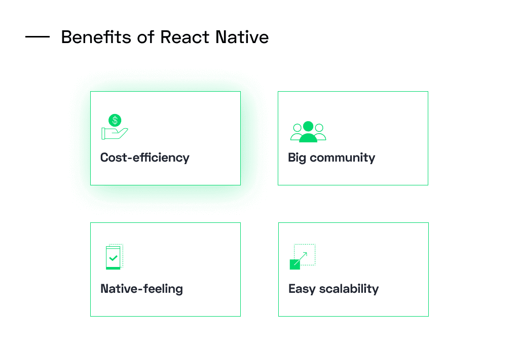 But what truly makes React Native a cost-effective solution is that it’s a web technology. And web development usually costs less than mobile app development. As a result, you will spend half as much developing with React than you would using Swift, Kotlin, Java and other native technologies.