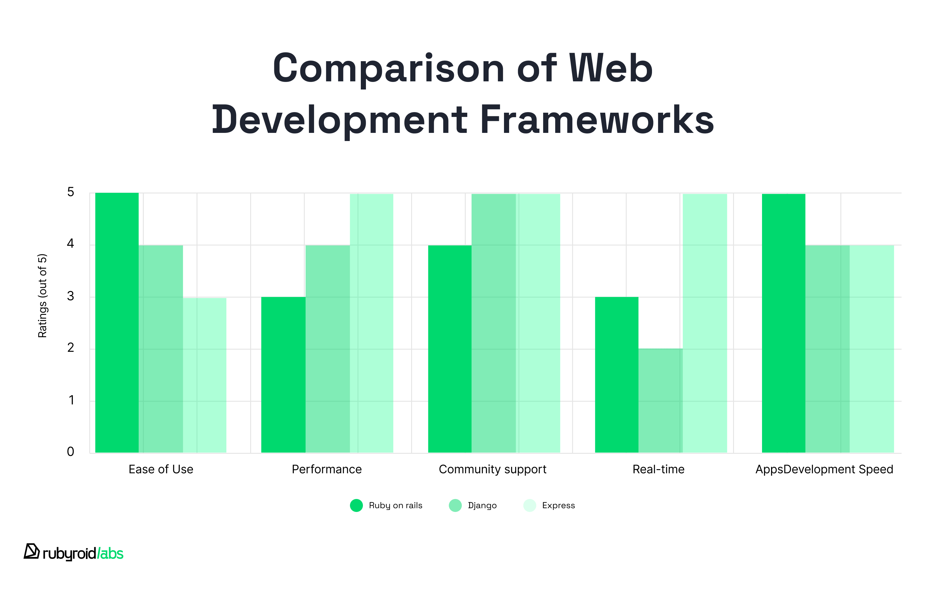Development Speed: RoR is the best in this category. Its opinionated nature and extensive libraries contribute to fast development cycles, allowing developers to deliver products much faster compared to using the Express and Django frameworks.