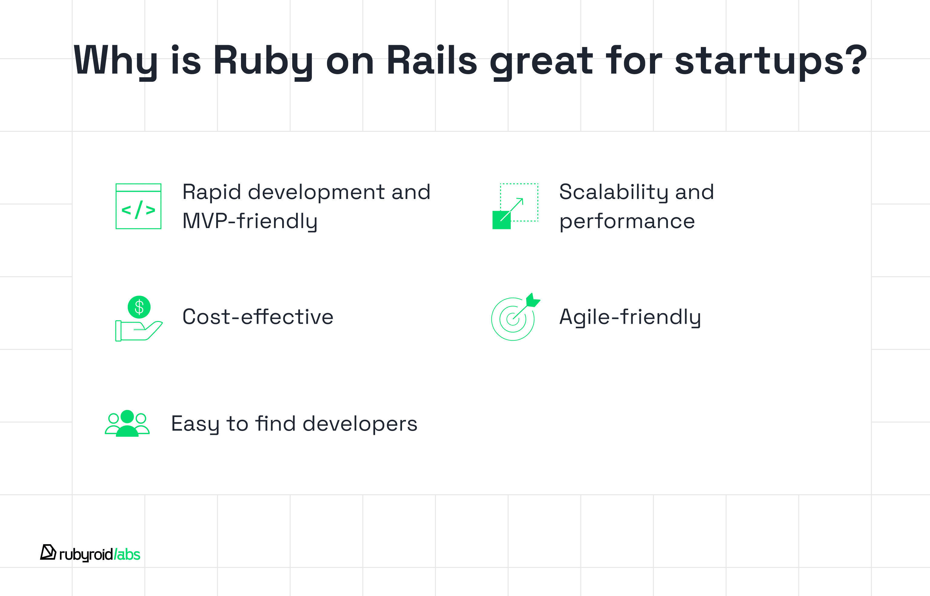 Ruby on Rails boasts a widespread community, ensuring a vast pool of talent that is familiar with the framework. This means startups can conveniently recruit developers who are proficient in Ruby on Rails, significantly reducing the time and costs involved in training and integrating new team members.